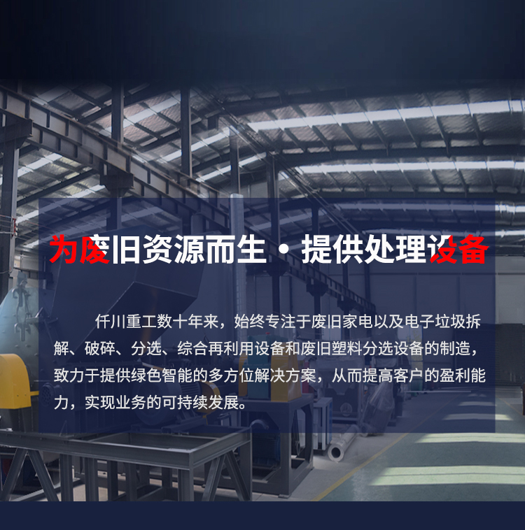 仟川重工數(shù)十年來,始終專注于廢舊家電以及電子垃圾拆解、破碎、分選、綜合再利用設(shè)備和廢舊塑料分選設(shè)備的制造,致力于提供綠色智能的多方位解決方案,從而提高客戶的盈利能力,實(shí)現(xiàn)業(yè)務(wù)的可持續(xù)發(fā)展。